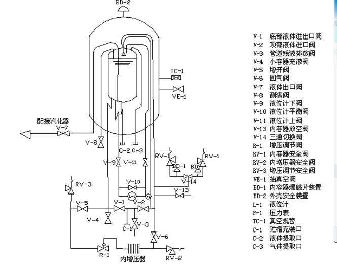 3.2.4檢查貯槽壓力是否正常,當貯槽壓力接近或等于最高工作壓力時,須打開內筒放空閥V-13泄壓。